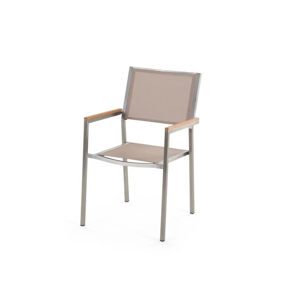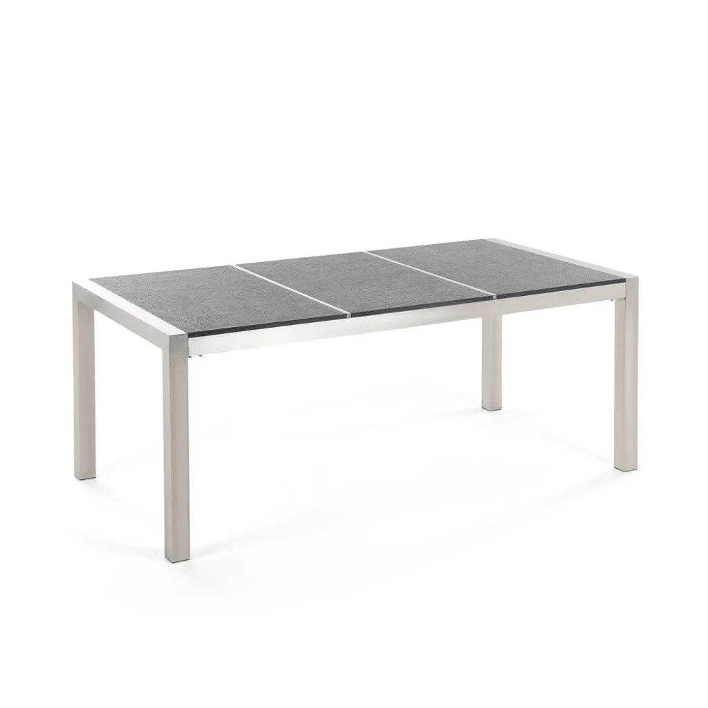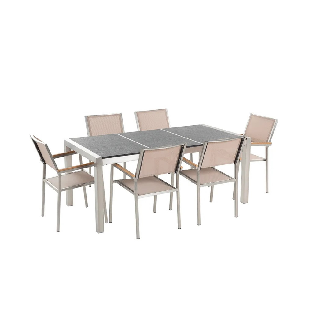 Dieses Garten-Tischset wird viele Jahre das absolute Highlight auf Ihrer Terrasse sein! Das exquisite Tischset aus wertvollem Edelstahl und Naturstein ist ein ganz besonderes Modell in unserer Produktepalette. Die Materialien der Tischplatte bilden ein Zusammenspiel, welches an Robustheit und Eleganz kaum zu übertreffen ist. Der glänzende Rahmen aus gebürstetem Edelstahl ist äusserst stabil und wasserfest. Die schwarze geflammte Natursteinplatte ist extrem witterungsbeständig und perfekt verarbeitet, so bildet sie eine unverwüstliche Tischoberfläche 180 x 90 cm. Die sechs Designer Stühle mit dem standfesten Gestell und erstklassiger UV- beständiger Textilsitzfläche in beige harmonieren perfekt mit dem robusten Tisch. Durch die Langlebigkeit und äussert einfache Pflege werden Sie dieses fortwährende Tischset über viele Sommer in Ihrem Garten bewundern können. Diese grossartigen Gartenmöbel, welche auch noch in weiteren Farben und Materialien erhältlich sind, werden der Hingucker in Ihrem Garten.