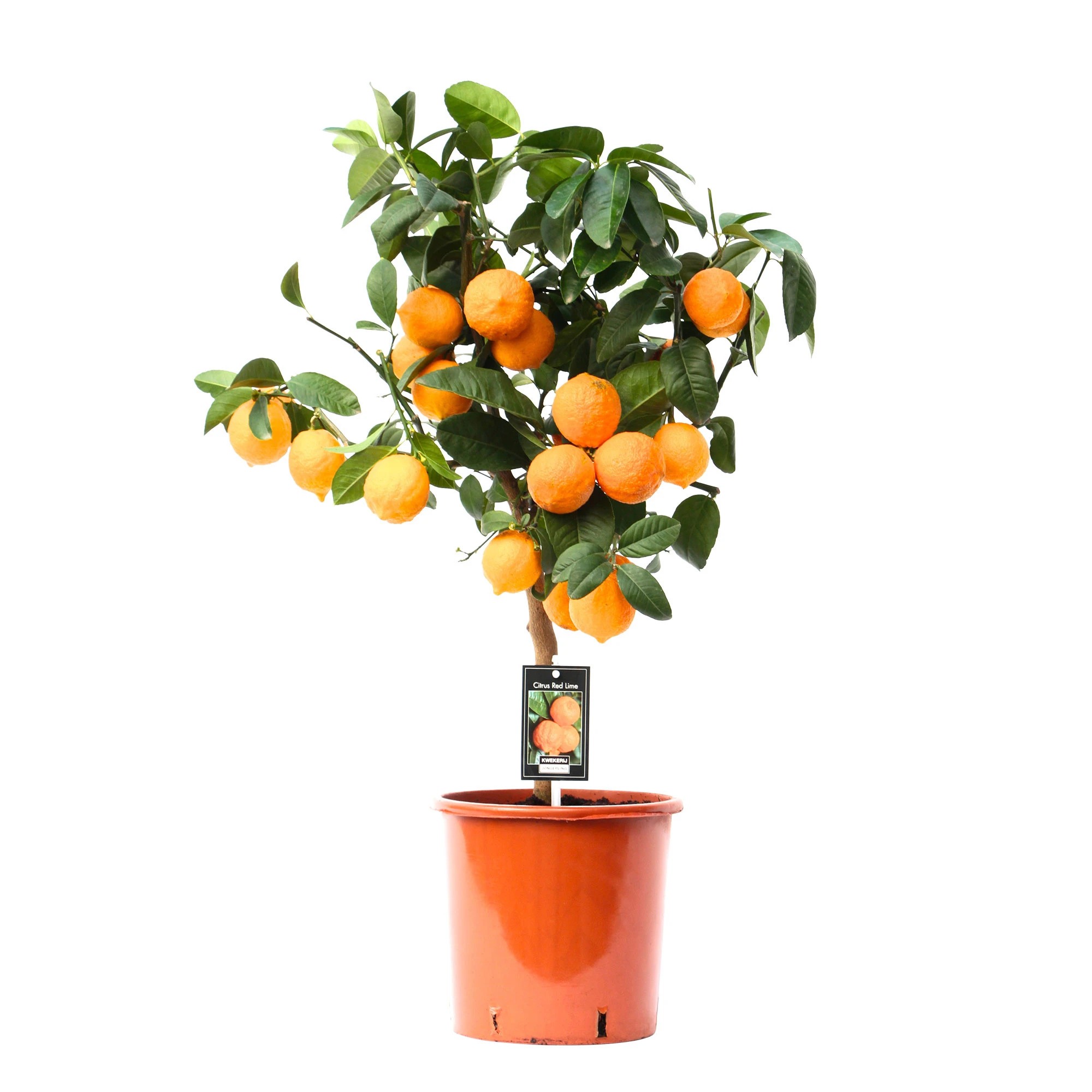 Der Limetten Baum 'Red Line' (Citrus aurarantifolia) sorgt für eine tropische Atmosphäre. In Ihrem Wohnzimmer, Garten oder auf Ihrer Terrasse. Die Früchte dieses duftenden Baumes sind rot! Rote Limetten, die als Hingucker am Stamm erstrahlen. Der Baum kann sowohl drinnen als auch draussen stehen. Auch Schmetterlinge sind verrückt nach dem 'Red Lime'! Der Obstbaum blüht im Frühjahr. Mit weissen Blüten. Im zweiten Jahr nach dem Pflanzen wachsen an dem Baum rote Früchte. Diese sind jedoch nicht essbar. Aber sehr dekorativ!